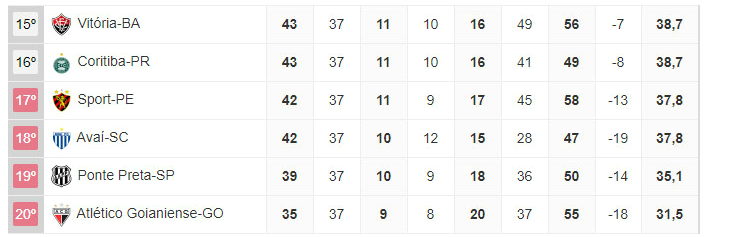 Atlético Goianiense e Ponte Preta já foram rebaixados da Série A do Campeonato Brasileiro. Vitória, Coritiba, Sport e Avaí, por outro lado, terão mais uma oportunidade para evitarem o mesmo destino. A última rodada do Brasileirão será realizada neste domingo, às 16 horas de Natal.