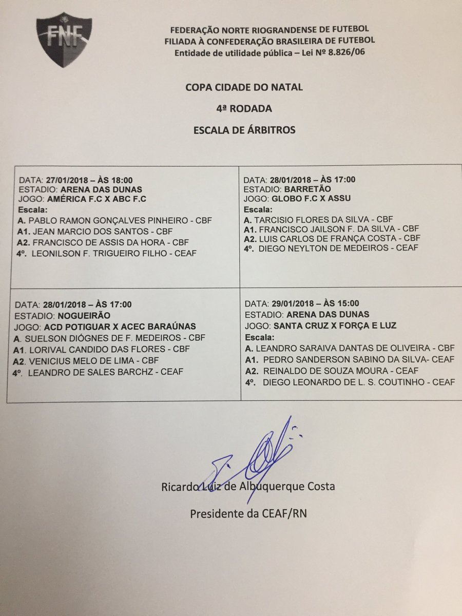 A Comissão de Arbitragem de Futebol do RN, definiu nesta quinta-feira (25) a escala dos árbitros que estarão trabalhando na quarta rodada do Campeonato Potiguar, nos dias 27, 28 e 29 de janeiro de 2018.