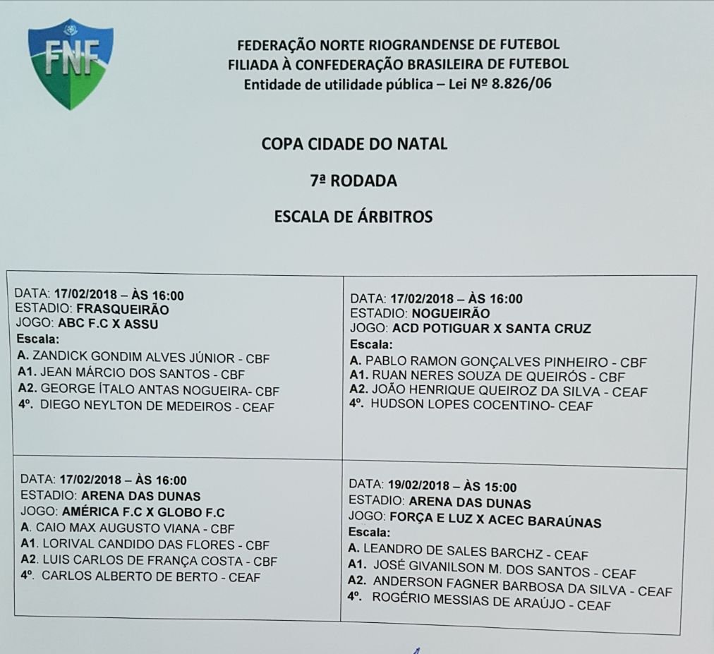 A Comissão de Arbitragem de Futebol do RN, definiu nesta quinta-feira, a escala de árbitros que estarão trabalhando na sétima e última rodada da Copa Cidade do Natal.