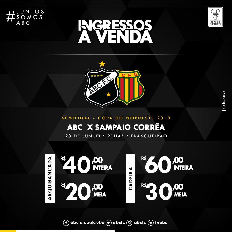 O ABC FC definiu os preços dos ingressos para a partida entre ABC e Sampaio Corrêa, nesta quinta-feira (28), às 21;45, valendo pelo jogo da volta, da Copa do Nordeste. Lembrando que no primeiro jogo, o Sampaio Corrêa foi o vencedor, ao triunfar diante do ABC por 1 a 0, com a vantagem do empate.