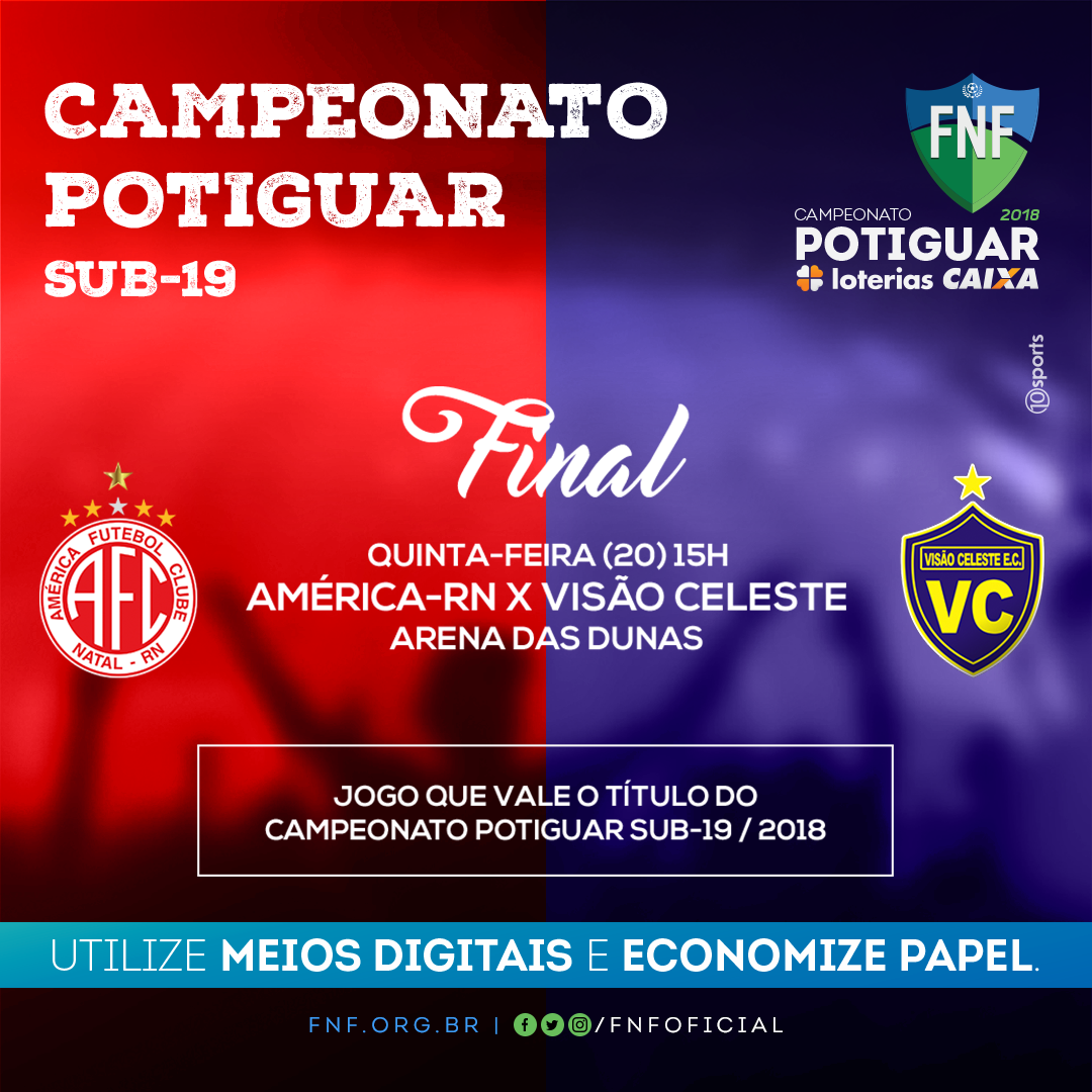 A decisão do Campeonato Potiguar Sub-19 Loterias Caixa 2018 acontece nesta quinta-feira (20), às 15h, na Arena das Dunas, em Natal. Em campo, América-RN e Visão Celeste, equipes que se enfrentaram na primeira fase da competição e que, desta vez, farão o confronto final do torneio.