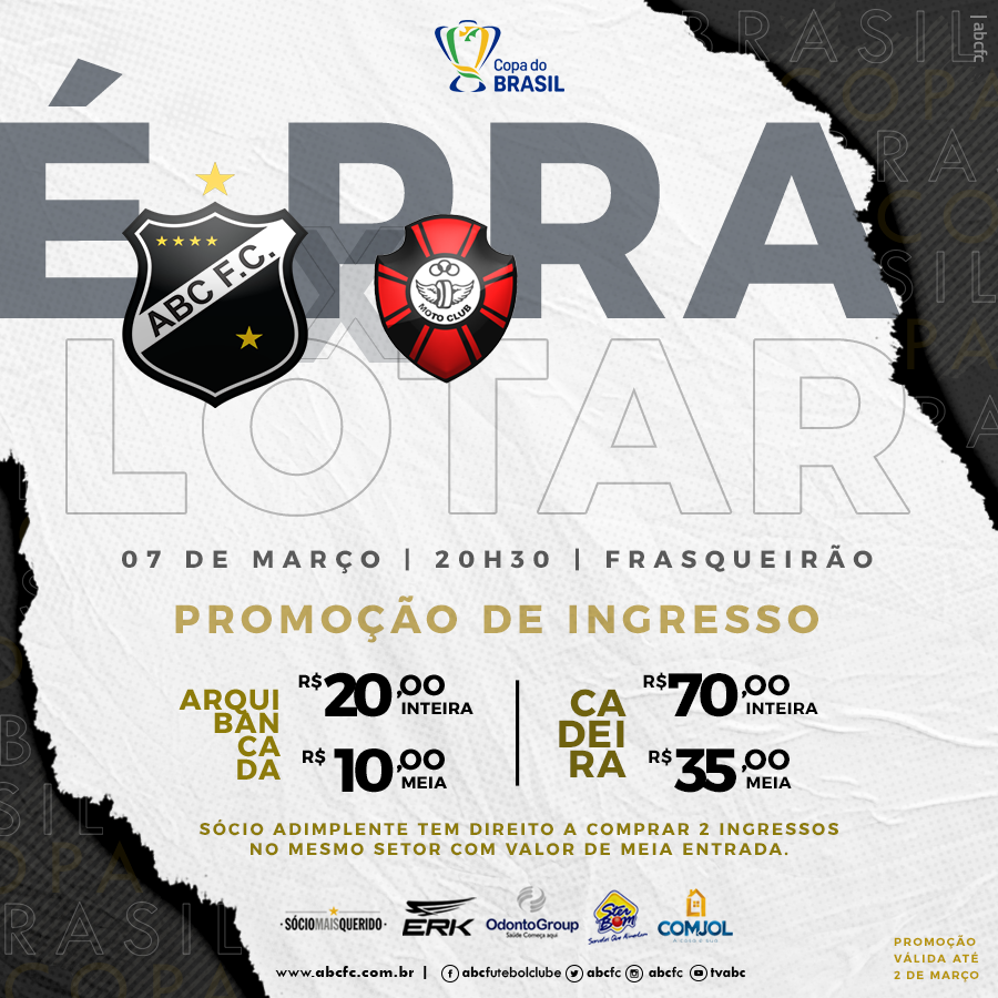 Após conquistar a Copa Cidade do Natal, ao vencer o seu maior rival o América por 2 a 1, numa virada sensacional, na última quarta-feira (20), o time alvinegro já pensa em outra competição, e o foco é a milionária Copa do Brasil, onde o ABC enfrentará no dia 7 de março (quinta-feira), às 20h30, o Moto Club/MA, pela segunda fase. E a diretoria alvinegra fez uma promoção para lotar o Frasqueirão.