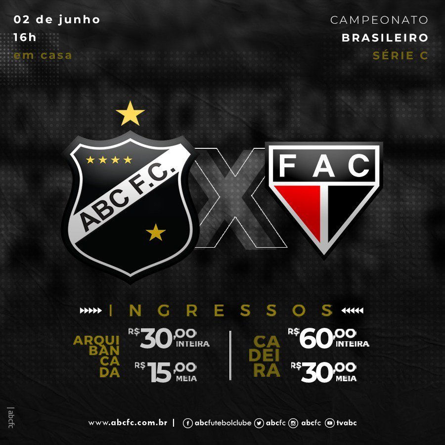 O ABC enfrentará o Ferroviário (CE) no próximo domingo (2), no Frasqueirão. O jogo é válido pela sexta rodada do Grupo A da Série C do Campeonato Brasileiro e o alvinegro precisa da vitória para sair da temida zona de rebaixamento. Os ingressos estão à venda a R$ 30 (inteira) e R$ 15 (meia) para arquibancada, e R$ 60 (inteira) e R$ 30 (meia) para as cadeiras.