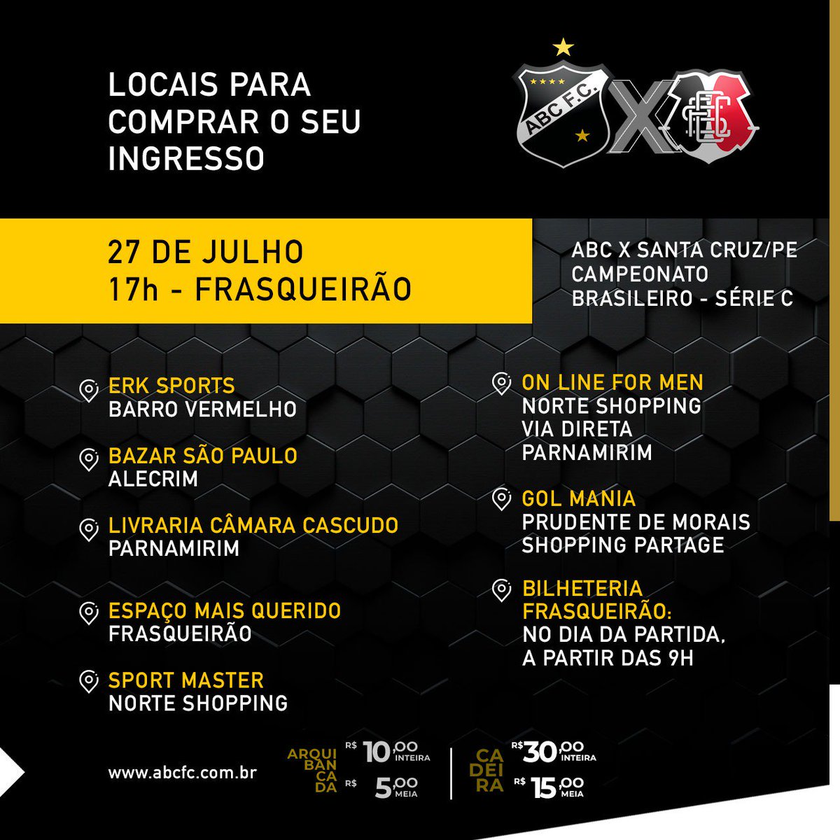 O ABC se prepara para mais um compromisso dentro do Campeonato Brasileiro da Série C. No próximo sábado (20), o ABC enfrentará o Santa Cruz/PE, às 17h, no estádio Frasqueirão. A venda de ingressos para essa partida iniciou nesta segunda-feira (22), desde das 16h.