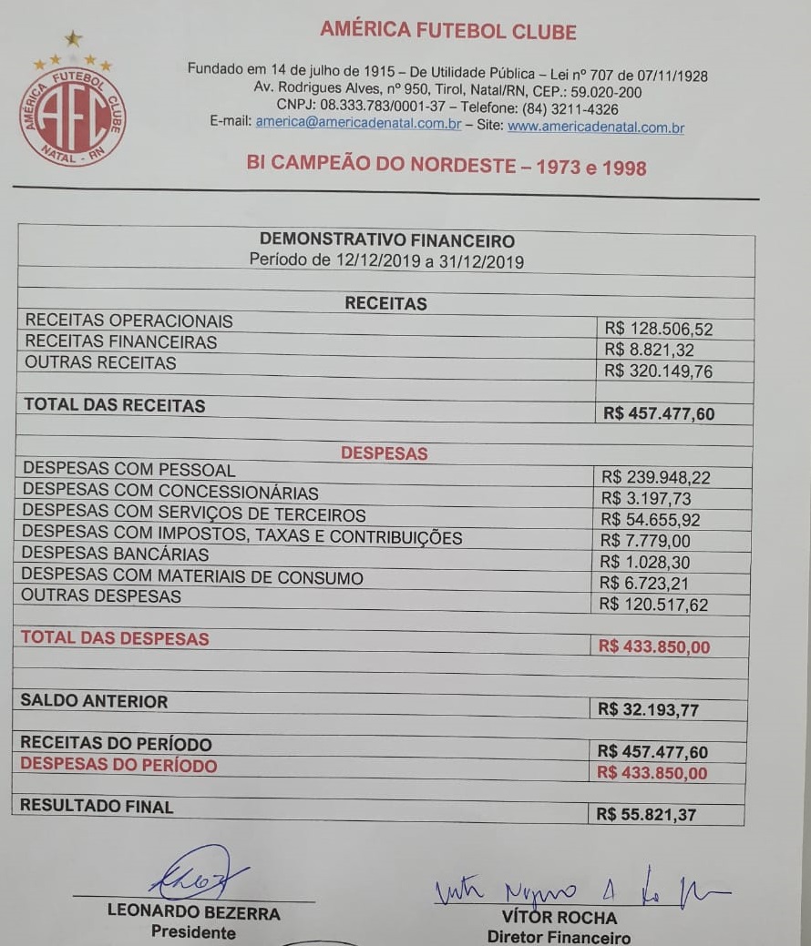 A Diretoria do América FC, por intermédio do presidente Leonardo Bezerra, divulgou no twitter do clube, o esboço do primeiro balanço financeiro do biênio 2020/2021 de 12 a 31 de dezembro de 2019.